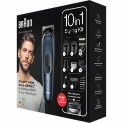 10 en 1 : le kit tondeuse Braun MGK7 pour homme est entièrement équipé pour la tonte de la barbe, du visage, des cheveux, des oreilles, du nez et du corps. Plus affûtée. Plus rapide. Plus efficace. La tête de tondeuse a une surface de coupe plus large, coupant plus de poils à chaque passage¹. Contrôle total de la tête aux pieds : le moteur AutoSense et le sabot de précision, avec 20 % de plastique en moins, offrent une tonte sans effort de la moustache, du bouc, de la barbe de 3 jours ou des poils du corps. Conçue pour durer: cette tondeuse pour homme est dotée de lames puissantes et inusables pour une tonte facile et uniforme des poils, quelle que soit leur longueur. Conception allemande avancée : 100 % étanche, avec une batterie Li-Ion puissante qui offre 100 minutes d'autonomie. La tondeuse est fournie avec un sabot pour zones sensibles, pour une tonte ultra-douce. Plus affûtée. Plus rapide. Plus efficace.¹ La surface de coupe plus large de la tête de tondeuse permet de capturer et de couper plus de poils à chaque passage par rapport aux tondeuses Braun précédentes. Créez votre look plus rapidement. Barbes courtes à longues Les sabots courts et longs vous aident à tailler et entretenir les barbes courtes à longues (de 0,5 à 21 mm). Rasage du corps Rasez toutes les parties de votre corps en toute sécurité, des aisselles au torse jusqu’à l’aine. Tondeuse à cheveux Coupez vos cheveux selon vos envies et avec précision grâce à deux sabots réglables pour différentes longueurs (de 0,5 à 21 mm). Définition des contours et tondeuse de précision Créez des lignes et des contours précis sur le cou et les joues avec la tête de tondeuse à barbe et la tête de tondeuse de précision. Convient pour tous les types de barbes La technologie AutoSense innovante de Braun adapte la puissance du moteur à l’épaisseur et à la densité des poils, pour une tonte facile et sans effort. Lavable et étanche Utilisez l’appareil en toute sécurité sous la douche ou rincez-le sous l’eau pour un nettoyage facile. Batterie Li-Ion longue durée 100 minutes d’autonomie. Recharge complète en 1 heure. Charge rapide en 5 minutes pour un rasage. Le kit styling optimal Le kit styling optimal tout-en-un offre 10 fonctions avec un seul appareil. ¹par rapport aux tondeuses Braun précédentes