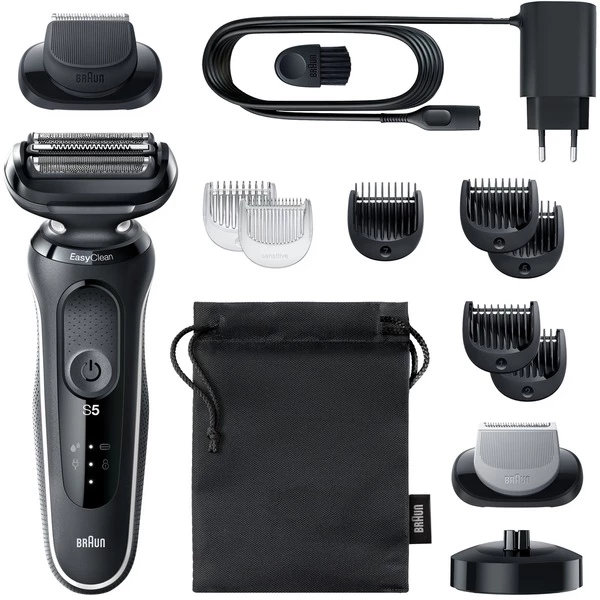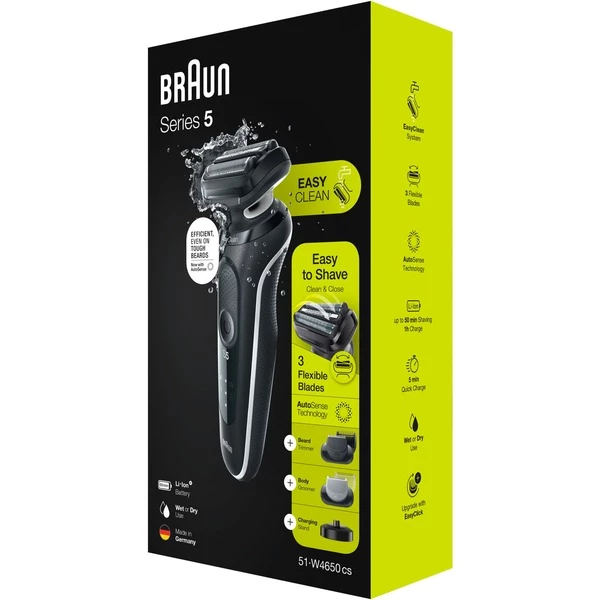 Le rasoir Braun Series 5 51-W4650cs dispose de trois éléments de rasage flexibles qui s’adaptent aux contours du visage – pour un rasage complet et facile. La tête de rasage dispose également du système EasyClean, qui permet un nettoyage rapide et facile sans retirer la tête de rasage. Grâce au système EasyClick, le rasoir peut être converti d’un simple clic. Les accessoires pour différents besoins de soins peuvent être facilement remplacés. La livraison comprend un accessoire de tondeuse à barbe EasyClick pour couper les barbes de 0,5 à 7 mm et un accessoire bodygroomer pour les soins complets du corps. La batterie lithium-ion intégrée permet jusqu’à trois semaines de rasage (50 minutes d’autonomie) et une charge rapide de cinq minutes suffisante pour une application. Grâce à la technologie Wet&Dry, la Braun Series 5 est 100% étanche et adaptée au rasage humide et sec. De plus, l’utilisation avec de la mousse ou du gel n’est pas un problème.