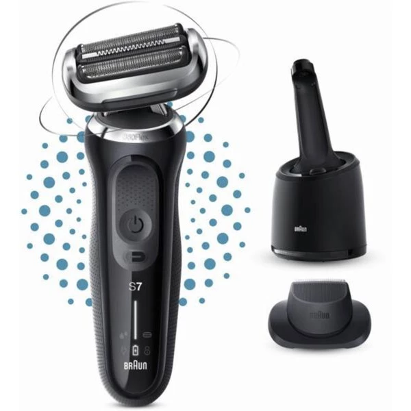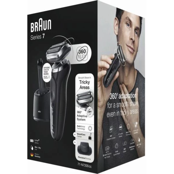 Le rasoir Braun Series 7 71-N7200cc avec réglage à 360 degrés et éléments de rasage mobiles indépendamment assure un rasage complet, même dans des endroits difficiles d’accès. La densité de la barbe est automatiquement détectée et la puissance du moteur est ajustée par la technologie AutoSense pour éliminer encore plus de poils à chaque bouffée. Grâce au système EasyClick, le rasoir peut être converti d’un simple clic. Les accessoires pour différents besoins de soins peuvent être facilement remplacés. Inclus est un accessoire de coupe de précision EasyClick pour couper la moustache et les brûlures latérales. La batterie lithium-ion intégrée permet jusqu’à trois semaines de rasage (50 minutes d’autonomie) et une charge rapide de cinq minutes suffisante pour une application. Grâce à la technologie Wet&Dry, la Braun Series 7 est 100% étanche et adaptée au rasage humide et sec. De plus, l’utilisation avec de la mousse ou du gel n’est pas un problème. La livraison comprend également une station de nettoyage pratique: à base d’alcool, elle élimine 99,9% de tous les germes et bactéries en appuyant sur un bouton. Il charge et entretient également le rasoir de manière entièrement automatique.