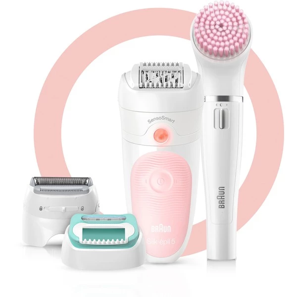 Découvrez le Coffret beauté 5, le kit premiers pas épilation et beauté 4-en-1 pour le visage et le corps. Épile, rase, tond, nettoie. Lépilateur électrique retire des poils 4 fois plus courts que ce que la cire peut attraper pour une peau douce jusquà 4 semaines. La technologie SensoSmart de épilateur électrique femme garantit une pression optimale pour offrir les meilleurs résultats. Comprend un accessoire rasoir et tondeuse pour les poils des zones sensibles. La brosse visage ultra sensible nettoie délicatement votre peau. Utilisation sans fil offrant jusquà 30 minutes dautonomie. 100 % technologie Wet & Dry.
