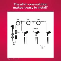 Les Outdoor Smart Spot Colour d’INNR sont des spots décoratifs à utiliser dans le jardin ou sur la terrasse. Ils produisent une lumière blanche chaude à froide ou, si nécessaire, colorée avec jusqu’à 230 lumens et peuvent être contrôlés via une application ou une voix. Cet ensemble de démarrage contient trois spots lumineux et les accessoires nécessaires pour les mettre directement en service. Les spots peuvent être fixés soit à un mur ou une clôture, soit au sol. Le câble et le transformateur sont également inclus.