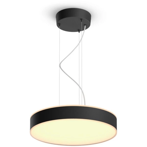 La suspension White Ambiance Enrave crée avec une lumière douce, orientée vers le haut, indirecte et un éclairage puissant vers le bas pour beaucoup d’atmosphère dans la salle à manger, le salon et la chambre à coucher. Le palan à câble offre une flexibilité supplémentaire grâce au réglage de la hauteur. Ce luminaire produit une lumière blanche chaude à blanche froide. De nombreuses autres fonctions d’éclairage intelligent peuvent être mises en œuvre via un pont Hue (non inclus). Un gradateur est également inclus. La LED intégrée de ce plafonnier génère un flux lumineux allant jusqu’à 4300 lumens (réglage par défaut 3300 lumens), le luminaire dispose d’une interface Bluetooth.