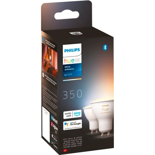 Lumière atmosphérique au format spot: La Hue White Ambiance GU10 est une lampe LED intelligente qui produit une lumière blanche chaude à blanche froide – économe en énergie et avec prise en charge de Bluetooth, Zigbee, intégration dans les environnements Hue existants ou contrôle via un assistant vocal. Cet ensemble contient deux ampoules pour la base GU10.