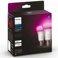 Philips Hue White and Color ambiance A60 – Ampoule connectée E27 – 800 (lot de 2). Type: Ampoule intelligente, Couleur du produit: Blanc, Interface: Bluetooth/Zigbee. Classe d’efficacité énergétique: F, Type de source d’alimentation: Secteur, Consommation d’énergie (mode veille): 0,5 W. Largeur: 60 mm, Profondeur: 60 mm, Hauteur: 110 mm. Largeur du colis: 146 mm, Profondeur du colis: 72 mm, Hauteur du colis: 174 mm. Quantité: 2 pièce(s), Nombre d’ampoule(s) de teinte incluse(s): 2 ampoule(s)