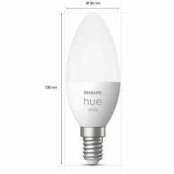 Philips Hue White Flamme – Ampoule connectée E14. Type: Ampoule intelligente, Couleur du produit: Blanc, Interface: Bluetooth/Zigbee. Classe d’efficacité énergétique: F, Consommation d’énergie (mode veille): 0,5 W, Consommation (max): 5,5 W. Largeur: 72 mm, Profondeur: 55 mm, Hauteur: 174 mm. Largeur du colis: 72 mm, Profondeur du colis: 55 mm, Hauteur du colis: 174 mm. Quantité: 1 pièce(s), Nombre d’ampoule(s) de teinte incluse(s): 1 ampoule(s)