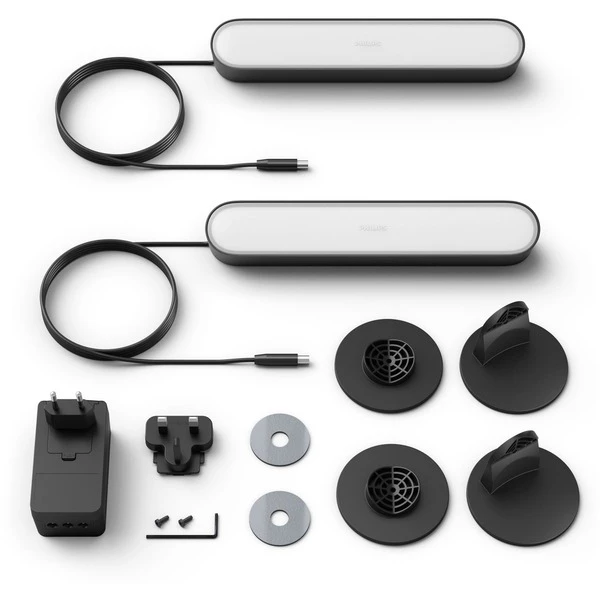 Design compact l’expérience de la lumière totale Créez un bain de lumière coloré et connecté avec le design épuré de la Hue Play en noir. Ce pack de 2 Hue Play, qui comprend deux barres lumineuses et une alimentation électrique permettant de connecter jusqu'à trois luminaires, peut être placé debout, à l'horizontale ou au dos de votre téléviseur grâce aux supports fournis.