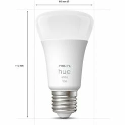 Philips Hue White Kit de démarrage : 2 ampoules connectées E27 (1100). Type: Kit d’éclairage intelligent, Couleur du produit: Blanc, Interface: Bluetooth/Zigbee. Classe d’efficacité énergétique: F, Consommation d’énergie (mode veille): 0,5 W, Consommation (max): 9,5 W. Largeur: 61 mm, Profondeur: 61 mm, Hauteur: 110 mm. Largeur du colis: 176 mm, Profondeur du colis: 146 mm, Hauteur du colis: 140 mm. Quantité: 2 pièce(s), Câbles inclus: LAN (RJ-45), Nombre d’ampoule(s) de teinte incluse(s): 2 ampoule(s)